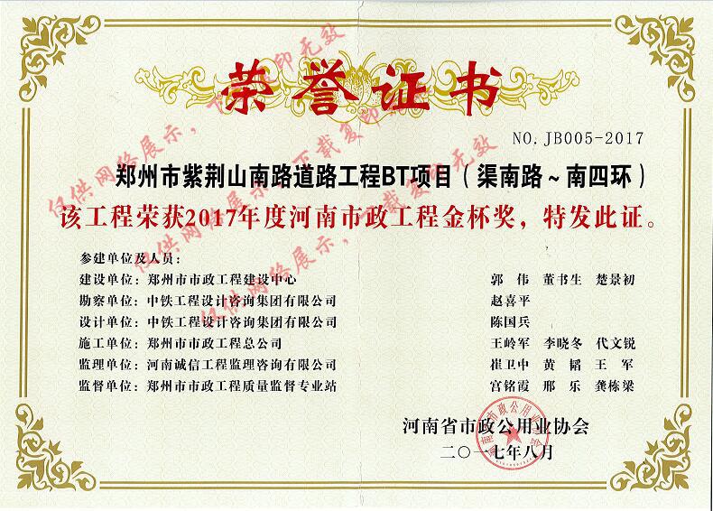 2017年度河南市政工程金杯獎鄭州市紫荊山南路道路工程BT項目(渠南路~南四環(huán))