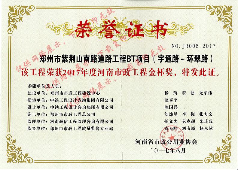 2017年度河南市政工程金杯獎鄭州市紫荊山南路道路工程BT項目(宇通路~環(huán)翠路)
