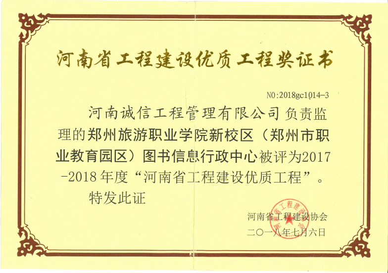 鄭州市旅游職業(yè)學(xué)院新校區(qū)圖書信息行政中心別評為2017-2018年度“河南省工程建設(shè)優(yōu)質(zhì)工程”