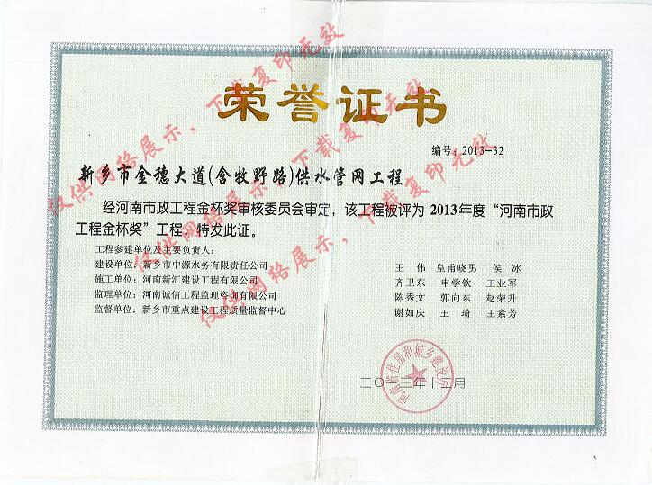 2013年度河南省市政工程金杯獎(jiǎng)新鄉(xiāng)市金穗大道供水管網(wǎng)工程