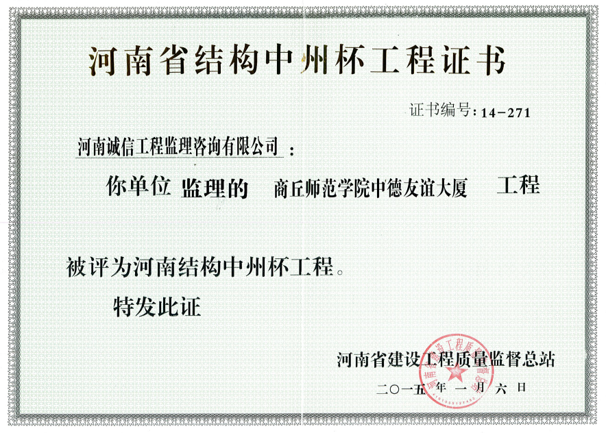 2015年商丘師范學(xué)院中德友誼大廈工程被評(píng)為“河南省結(jié)構(gòu)中州杯工程”