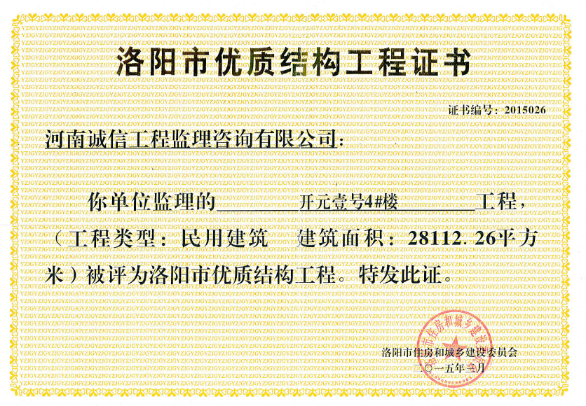 2015年開元壹號(hào)工程被評(píng)為“洛陽市優(yōu)質(zhì)結(jié)構(gòu)工程”